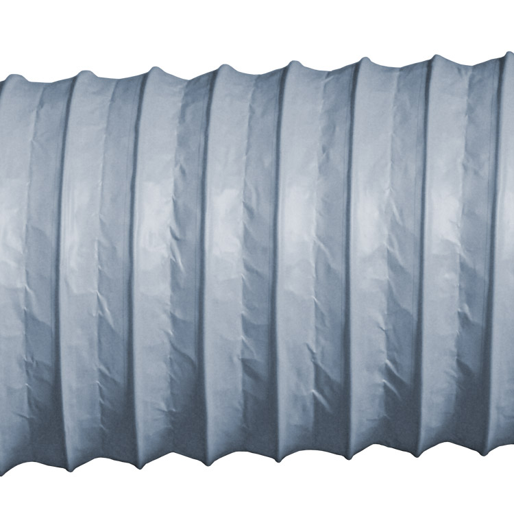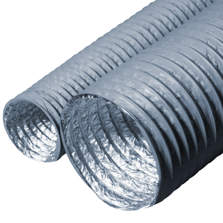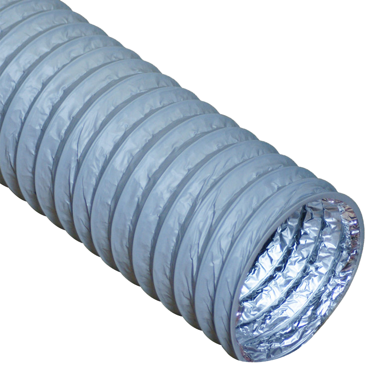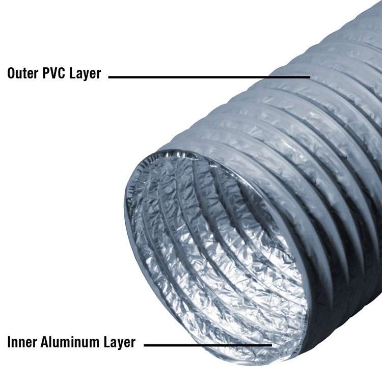 These HVAC ducts are made using a combination of materials, including PVC, aluminum and a layer of PET film. The outer layer of the Ventilation Flex is a tough, gray-colored PVC, with a wire helix winding through it to provide additional strength and support to the body of the hose. On the inside of the hose, the inner walls are covered with silver aluminum.