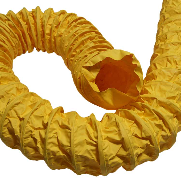 The “Wind Handler” flexible air duct is a single-ply neoprene coated polyester fabric hose designed for air applications. The neoprene coated duct materials give this product good chemical stability and allow it to maintain flexibility and compressibility over a wide temperature range. This air ventilation hose is reinforced with a spring wire helix to provide extra strength to the duct. The hose is very compressible which allows for easy storage and mobility in tight spaces. This ventilation duct has a 12 to 1 compression ratio, which means a 25 ft length will compress down to just over 2 feet. This lightweight and transportable product is perfect for applications on the go!