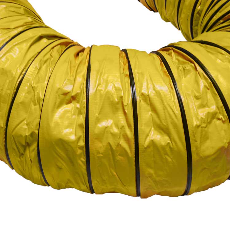The “Air Ventilator Yellow” flexible ducting hose can be useful in many industrial air movement applications. These lightweight hoses are made from PVC vinyl coated polyester fabric and has been reinforced with a spring steel wire helix for added strength when flexed. Each section of yellow flex duct is constructed with a protective external wear-strip. The protective wear-strip provides an added layer of protection from dragging and scraping the hose material on the ground. All hose ends feature belted cuffed end for easy installation. This allows for quick and simple use without the need for clamps.