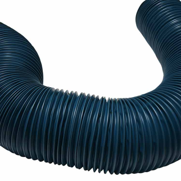 This is a general-purpose flex duct ideal for light material movement, non-abrasive dust, cost-conscious applications, and also as an air return duct. The “PVC Flexduct Light-Duty Blue” light-duty ducting has a working temperature range from -20 to +160 degrees Fahrenheit. Being made from PVC gives this lightweight hose excellent fatigue strength, tensile modulus, impact resistance, and bending strength. The “PVC Flexduct Light-Duty Blue” exhibits excellent life at cost efficient prices. This industrial duct is listed as UL 94V-0 flame retardant. PVC is an inherently fire resistant plastic, the only exception among the general-purpose plastics, because it contains more than 50% of chlorine. When PVC products are burned, hydrogen chloride gas resulting from thermal cracking slows down the continuous combustion reaction and prevents burning progress by warding off the PVC product surface from oxygen in the air.
