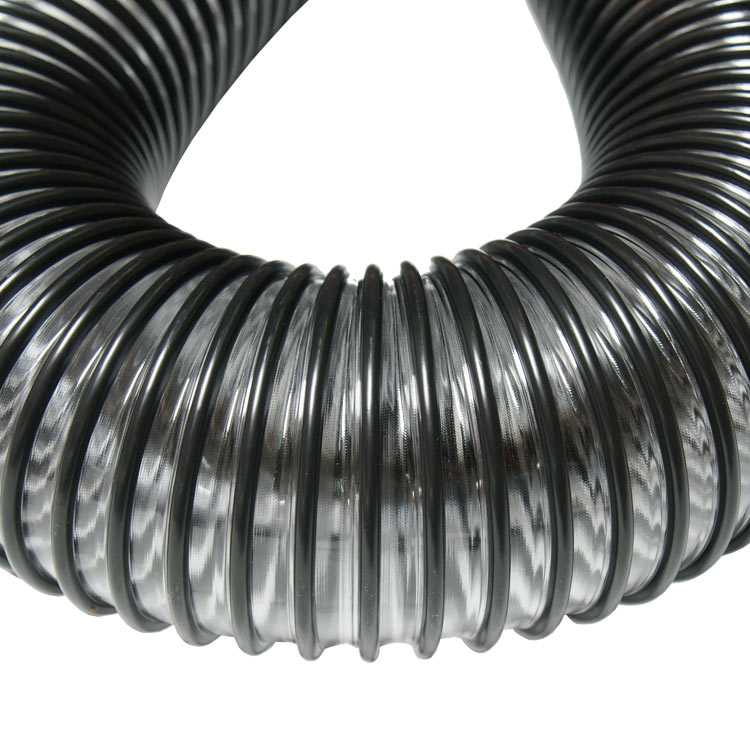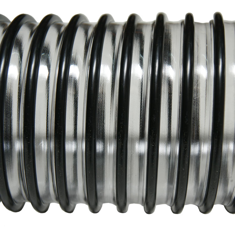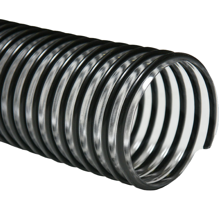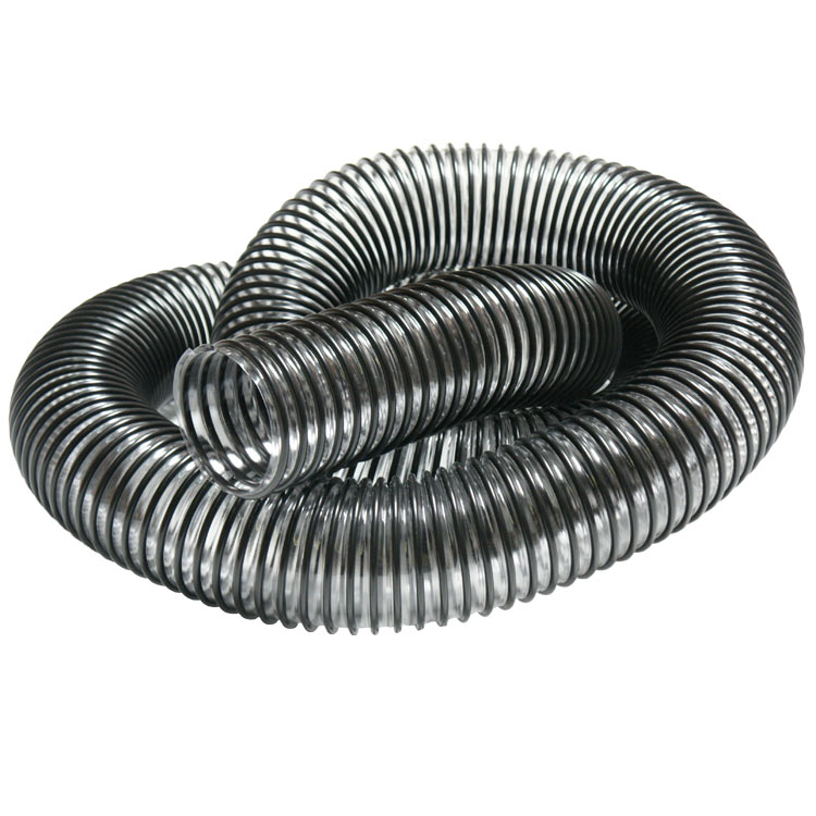 The “Smooth-Tube PVC” clear flexible hose is available in standard lengths of either 25 feet or 50 feet. Their levels of wall thickness can range from 0.030 inch, 0.032 inch, 0.035 inch, and 0.40 inch, depending on the PVC hoses’ ID Size. Available ID sizes are 2.5, 3, 4, 5, 6, 7, 8, 10, and 12 inches. It is an attractive hose, with a clear body accompanied by a black colored PVC helix. The clear body allows you to see the materials going through the flex ducting and will allow you to easily spot the source of any problems.