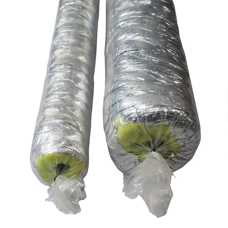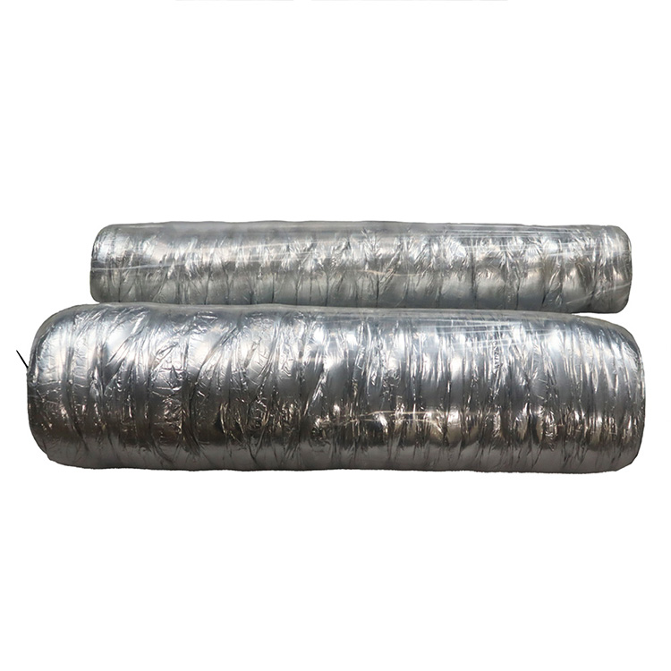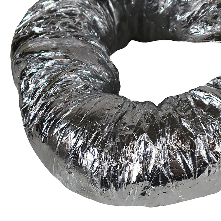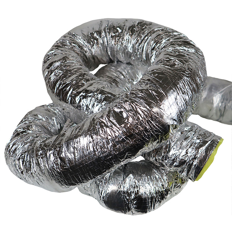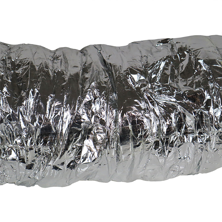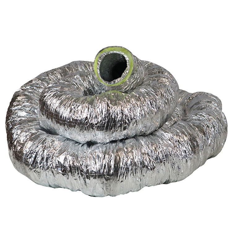 This hose is an insulated air duct with plies of aluminum foil that are separated with fiberglass duct wrap insulation. The three layers are (1) the jacket is made with silver fiberglass reinforced fabric while (2) the insulation is fiberglass wrap and (3) the liner is spiral aluminum foil duct. This insulated flexible ductwork is made for use as an air conditioner duct because it is insulated. The temperature range of this hose is – 20 F to + 160 F and the flexible ducting is available in 4-inch, 6-inch, 8-inch and 12-inch diameter sizes. All flexible hoses are 25-feet in length when stretched and have a five to one compression ratio. This means the duct is shipped in a compressed state and can expand up to 25 feet when stretched.