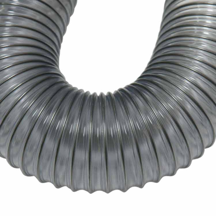 The “PVC Flexduct Medium-Duty” flexible hose is a medium-weight clear PVC wall hose reinforced with a spring steel wire helix for industrial air movement and light bulk material handling applications. PVC hose materials provide good compressibility and offer good chemical and moisture resistance. In addition, the spring steel wire helix featured on these duct materials provides extra protection. This flexible hose is great for applications where positive pressure will be present, as well as providing the user with an FDA or food grade acceptable material.