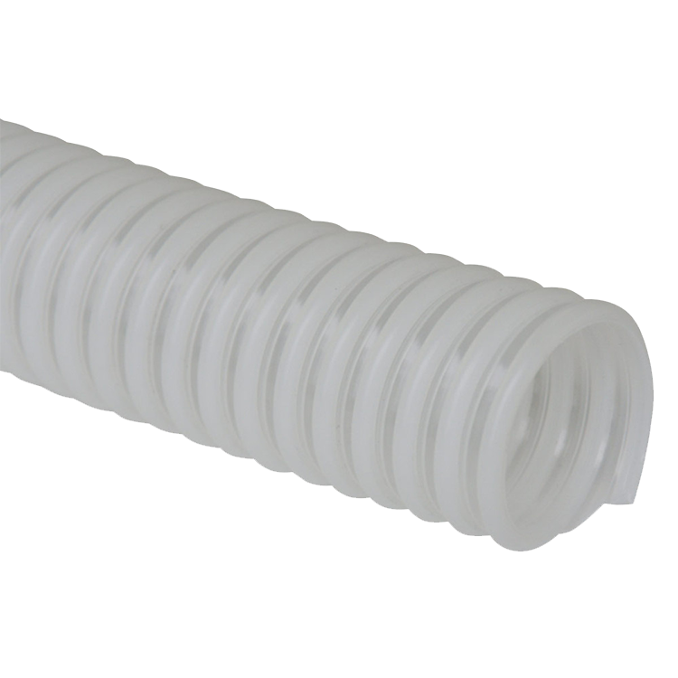 The “PE Flex Translucent” material transfer hoses are a medium weight hose recommended for light bulk material handling applications. The clear hose material is constructed using translucent medium strength polyethylene. The flex duct wall has been reinforced with a translucent integral polyethylene helix, designed for moving dust and other light materials. The translucent flex duct walls are crush resistant and make it easy to monitor material flowing through the inside. The translucent coloration also makes finding clogs and blockages easy. The hose material is manufactured with FDA acceptable food grade materials.