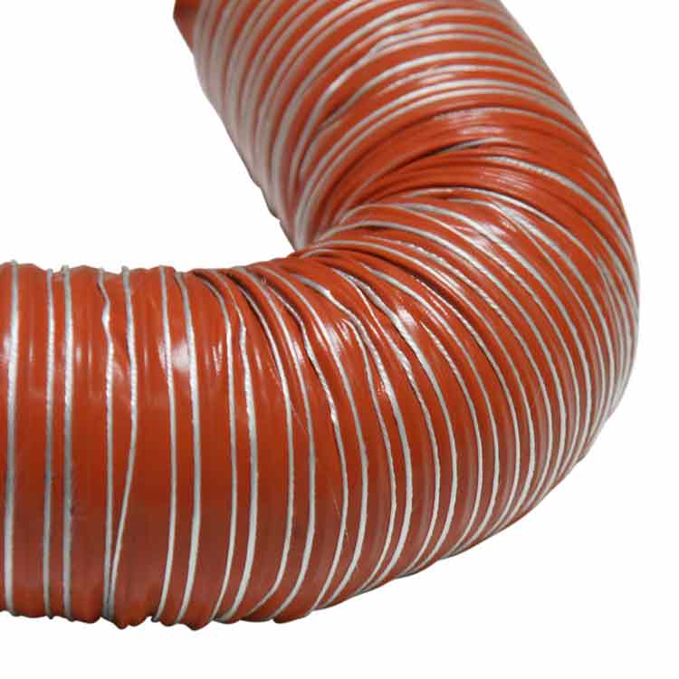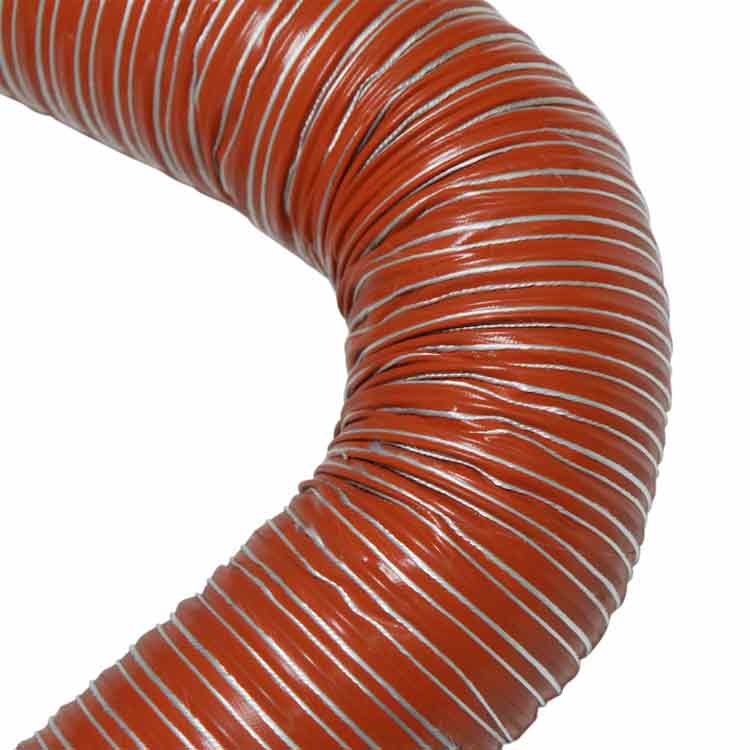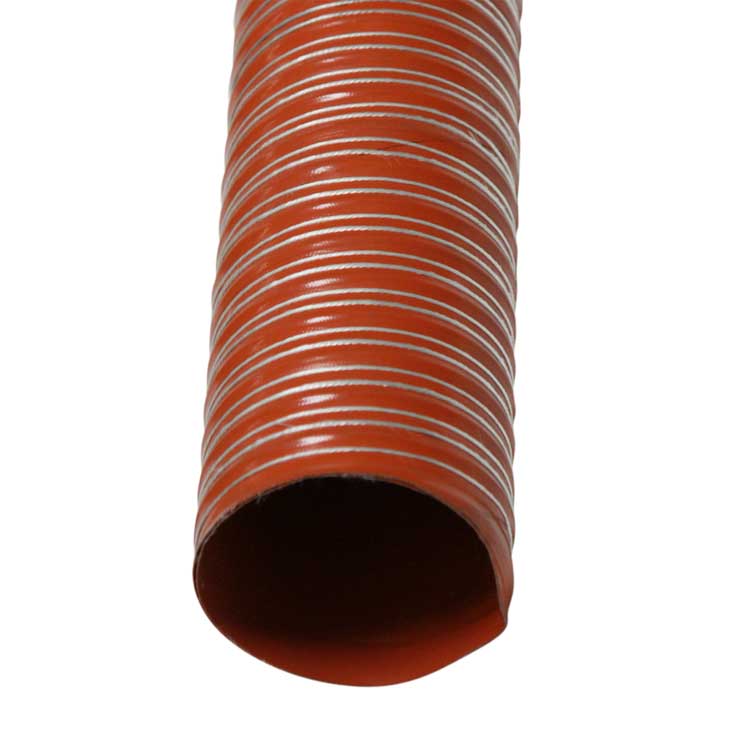 The “Silico-550 Double Ply” is a high temperature duct suited for a variety of applications involving hot air and fumes. This air ducting hose consists of double-ply silicone coated fiberglass reinforced with a spring steel wire helix & external filament fiberglass cord. This allows the high temperature duct to be suited for high-temp air handling applications that are ideal for plastic processing operations. The “Silico-550 Double Ply” is also a flexible air hose that has a narrow pitch for flexible venting. This allows the hose to offer a tight bending radius that is non-kinking while maintaining a smooth airflow. While the flexible air hose allows for flexible venting, it is not recommended for continuous flexing.