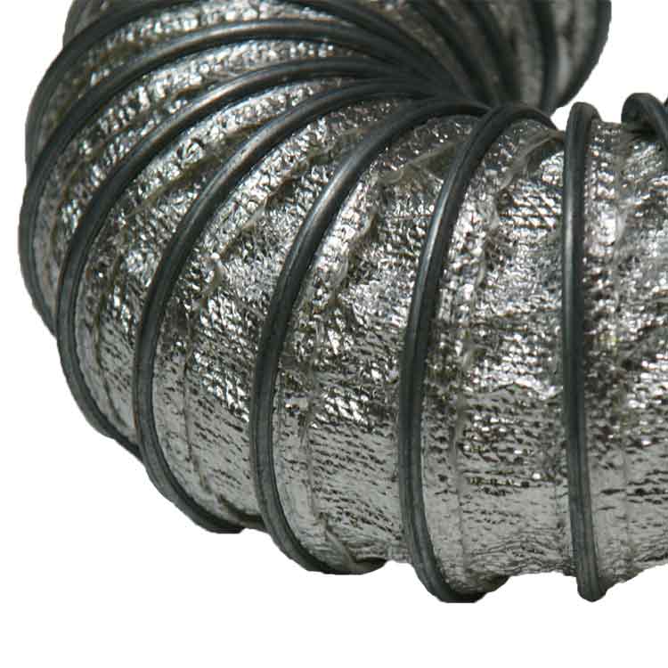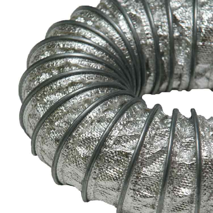The “Spiral-Lock (Alum FG) 1050” high temperature hose operates at extremely high and low temperatures. This fiberglass hose material has a temperature range of -65 degrees to +1050 degrees Fahrenheit and can intermittently withstand a high temperature of +1250 degrees Fahrenheit. The fiberglass hose material also makes the duct resistant to outside abrasions.