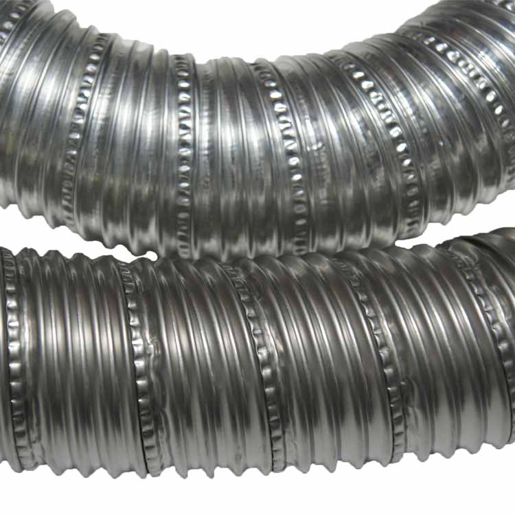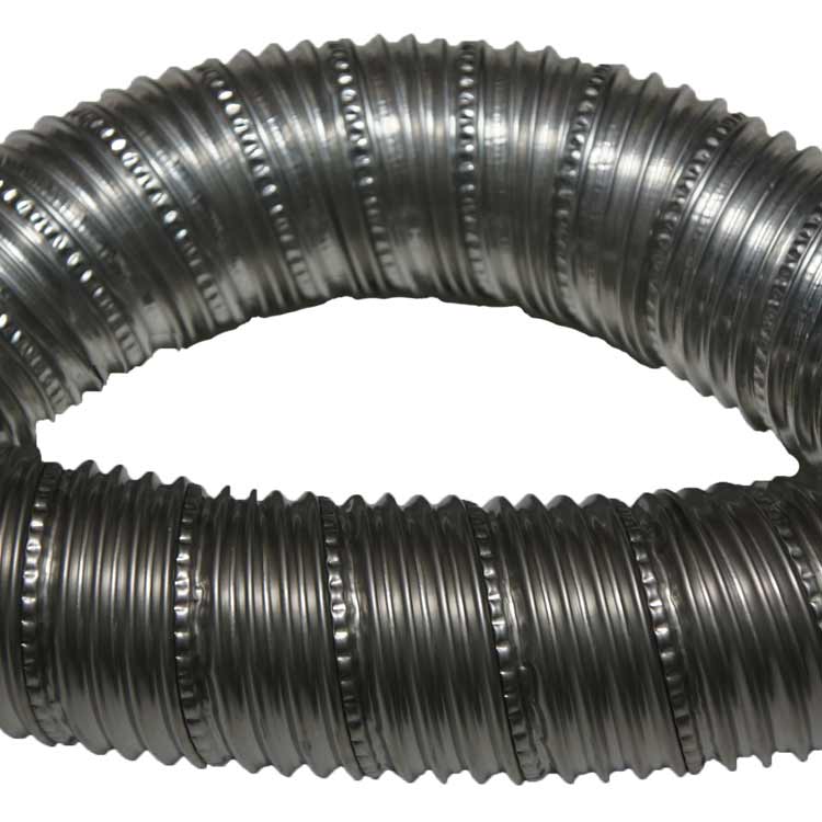 The “Aluminum Flex 400” hi-temp hoses are great for funneling above ambient industrial air and fume. The metallic silver lightweight hose is constructed from a single-ply, helically corrugated aluminum alloy. The walls of the flexible ducts are constructed using a durable four-ply finished seam that has been folded flat and crimped for binding and strength. With a working temperature range of -100 to + 400 degrees Fahrenheit, these aluminum ducts are built to withstand extreme temperature applications. They are made to resist fatigue, weathering, and most corrosive fumes and chemicals. Aluminum flexible ducts are far more durable than their elastomeric counterparts, even when corrosive fumes are present.