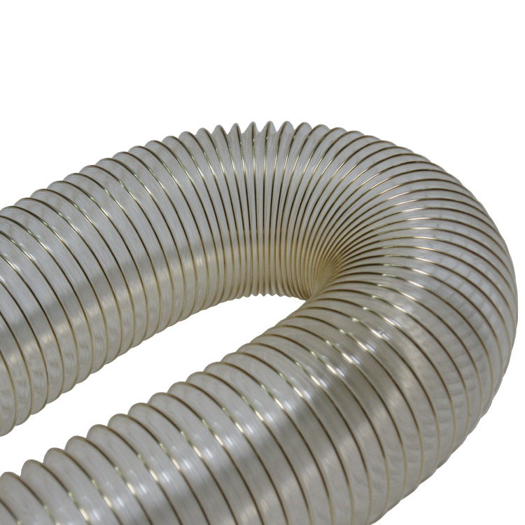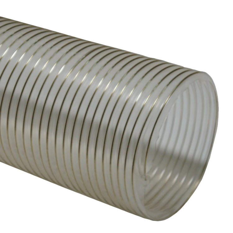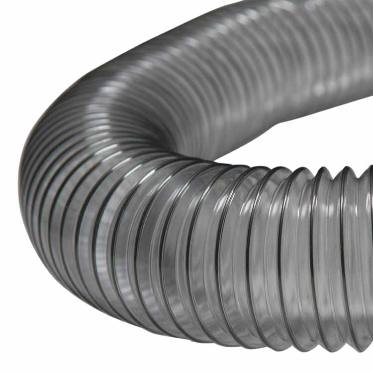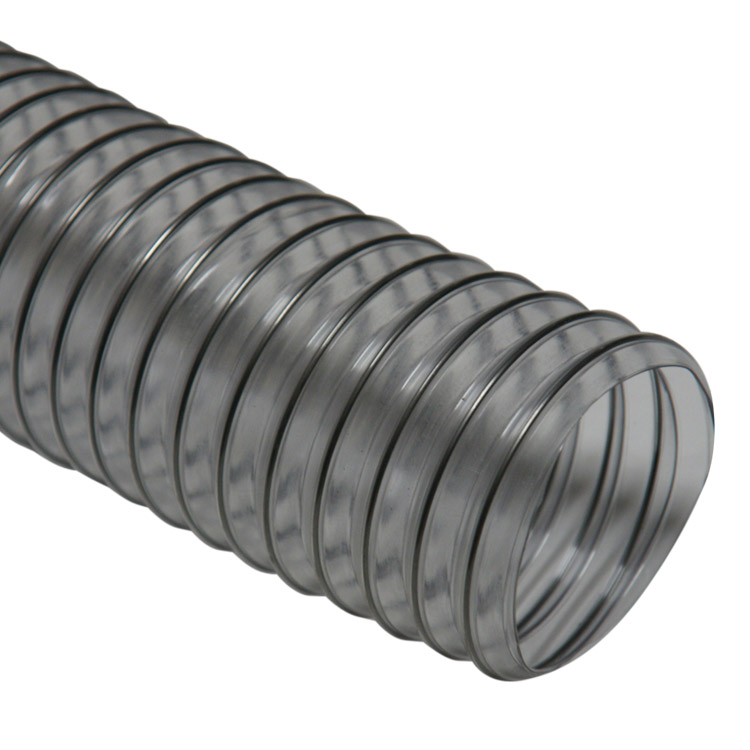 The “PVC Flexduct General Purpose Clear” is a cost-effective PVC hose suitable for a wide range of light to medium duty air, dust, and fume related applications. The body of this clear flexible hose is made from PVC material and is reinforced by a steel wire helix. The clear PVC material provides these air and dust collection hoses a moderate degree of chemical and moisture resistance.