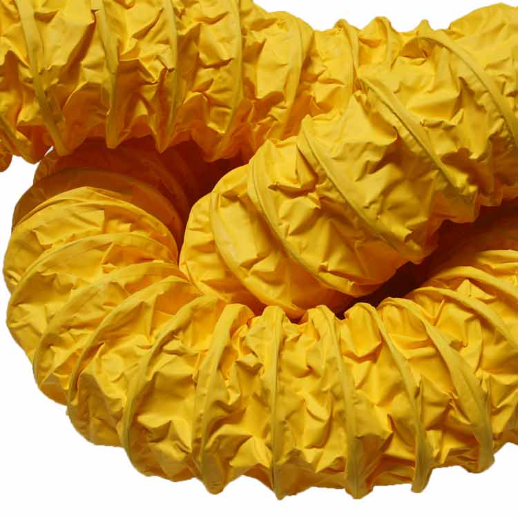 The “Air Ventilator Yellow” flexible ducting hose can be useful in many industrial air movement applications. These lightweight hoses are made from PVC vinyl coated polyester fabric and has been reinforced with a spring steel wire helix for added strength when flexed. Each section of yellow flex duct is constructed with a protective external wear-strip. The protective wear-strip provides an added layer of protection from dragging and scraping the hose material on the ground. All hose ends feature belted cuffed end for easy installation. This allows for quick and simple use without the need for clamps.
