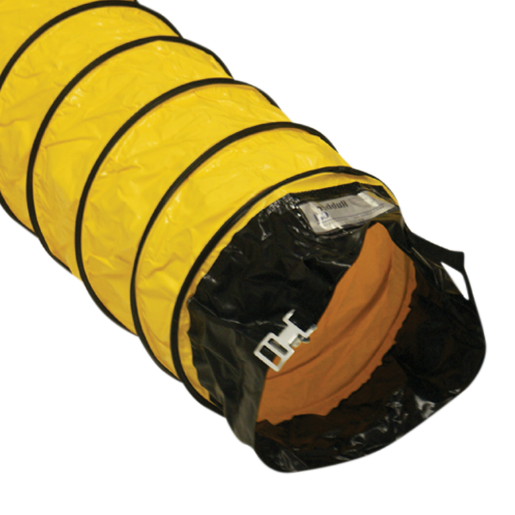 The “Wind Handler” flexible air duct is a single-ply neoprene coated polyester fabric hose designed for air applications. The neoprene coated duct materials give this product good chemical stability and allow it to maintain flexibility and compressibility over a wide temperature range. This air ventilation hose is reinforced with a spring wire helix to provide extra strength to the duct. The hose is very compressible which allows for easy storage and mobility in tight spaces. This ventilation duct has a 12 to 1 compression ratio, which means a 25 ft length will compress down to just over 2 feet. This lightweight and transportable product is perfect for applications on the go!