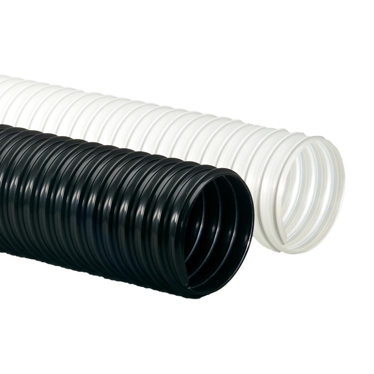 This is our best selling polyurethane duct because it combines flexibility, chemical resistance, and abrasion resistance. The high tensile strength of polyurethane also assures reliability and durability when using this product. Because polyurethane duct is tough, it can have thinner gauged walls when compared to rubber or vinyl. This polyurethane duct also has excellent resistance to hydrocarbons, chemicals, ozone, bacteria, fungus, moisture, and skin oils. This material handling hose is available in clear, which utilizes FDA acceptable materials (ideal for food and drug applications).