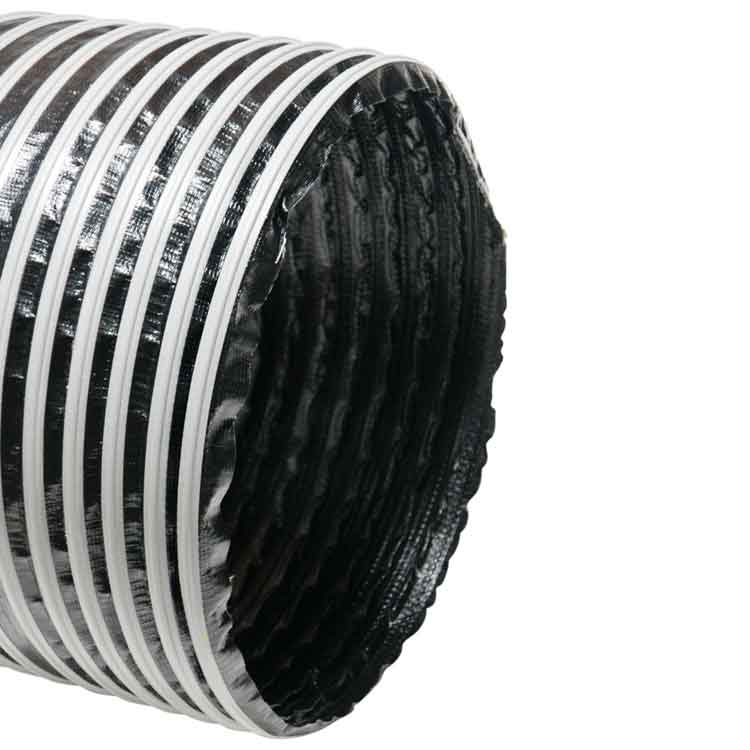 This flex ducting works in temperatures ranging from a low of -65 to a high of +225 degrees Fahrenheit. The “Urethane Flex Self Extinguishing” hose is made of Halogen-free flame retardant hose materials. Halogens (Flourine, Chlorine, Bromine, Iodine, Astaline) are salt formers. This is especially for the electronics industry that has an interest in products assembled without the use of these elements in the raw materials.