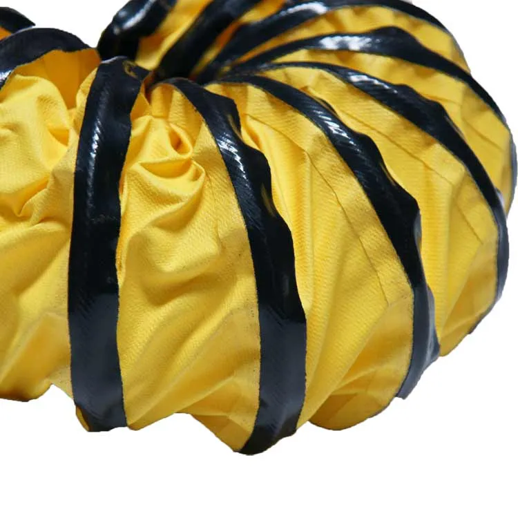The “Air Ventilator Yellow” flexible ducting hose can be useful in many industrial air movement applications. These lightweight hoses are made from PVC vinyl coated polyester fabric and has been reinforced with a spring steel wire helix for added strength when flexed. Each section of yellow flex duct is constructed with a protective external wear-strip. The protective wear-strip provides an added layer of protection from dragging and scraping the hose material on the ground. All hose ends feature belted cuffed end for easy installation. This allows for quick and simple use without the need for clamps.