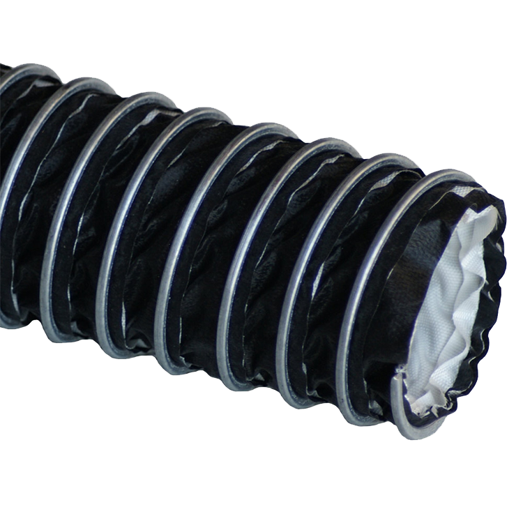 Teflon® hose offers superior chemical resistance and high temperature qualities, making it ideal for the harshest conditions. A Teflon duct generally consists of two parts. The first part is the base of the hose, which is typically a fabric type material such as fiberglass. The Teflon is then coated onto the hose, sealing the fabric and creating the highly chemical resistant lining for the hose. Typically wire reinforcement is used as the “backbone” of the hose, which also reduces kinking when the hose is flexed. Therefore a Teflon flexible duct hose behaves like a coated fabric hose while offering excellent chemical resistance. The wire reinforcement of Teflon flexible hoses is further generally made continuous throughout the length of Teflon hose segment. This confers onto the duct a strength and resilience prized by those in the commercial and industrial fields.