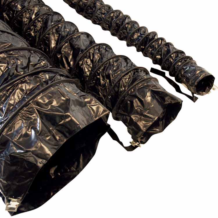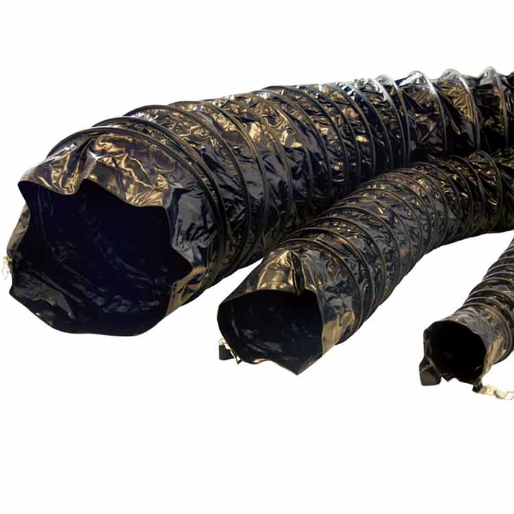 “Air Ventilator Black” flexible ducting is recommended for industrial air movement applications. The lightweight hose made from a durable PVC vinyl coated polyester fabric that has been reinforced with a spring steel wire helix for added strength and flexibility. The black flex ducting comes with a protective external wear-strip. The black wear-strip prevents the hose from prematurely wearing due to repeatedly being dragged across the ground.
