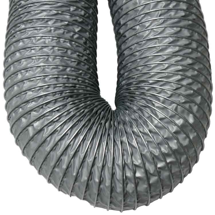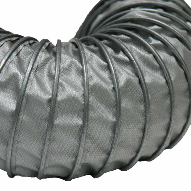 The “Spiral-Lock (Silicone 1P) 550” high temperature silicone hose comes in a standard length of 25 feet with plain cut ends and a silver finish. Internal diameter sizes for this flexible silicone hose range from 3 to 18 inches with ID tolerances of -0.00 to +0.125 inches. A polyurethane clip cover is also available, which provides added protection to the helix and other equipment attached to the hose. This fume exhaust duct is ideal for various applications involving fumes such as cold air supply, aircraft applications, vapor recovery, welding, vehicle exhaust systems, and high temperature venting. If you have questions or need additional information, please do not hesitate to give one of our ducting specialists a call today!