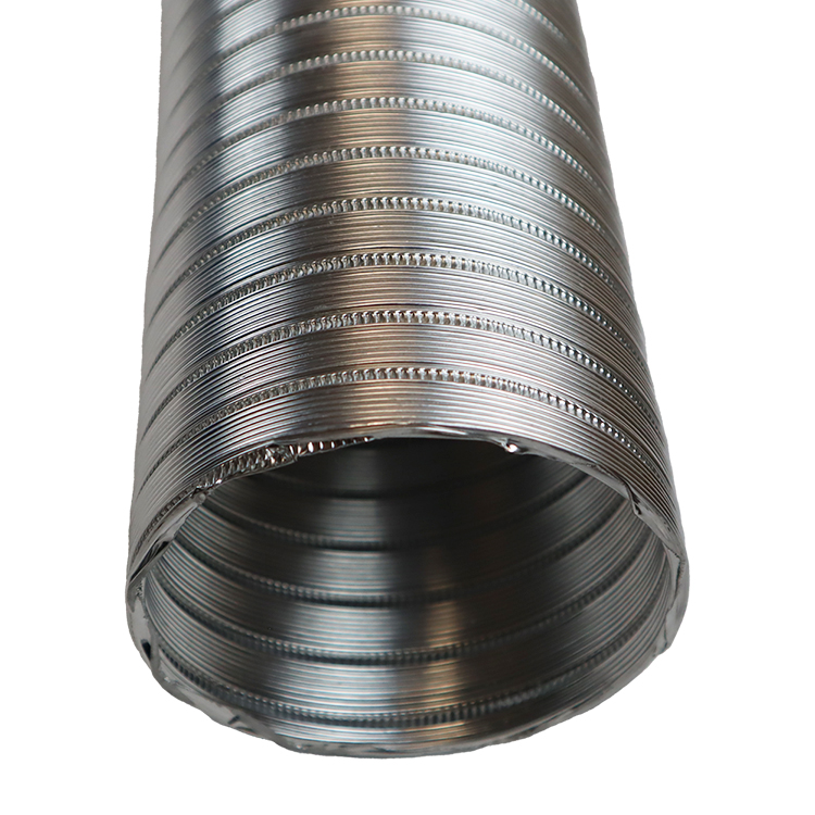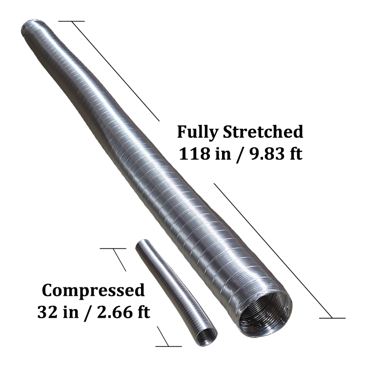 The Aluminum Flex 280 – Compressible is an aluminum duct that extends from 0.8 meters to 3 meters, a ratio of 1 to 3.7! This metal duct has a single-ply, helically corrugated structure—making it a very durable, as well as lightweight product. These helical corrugations are one part of the reason for why this duct can extend to over three times its compressed length!