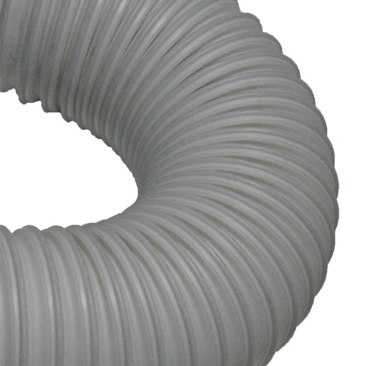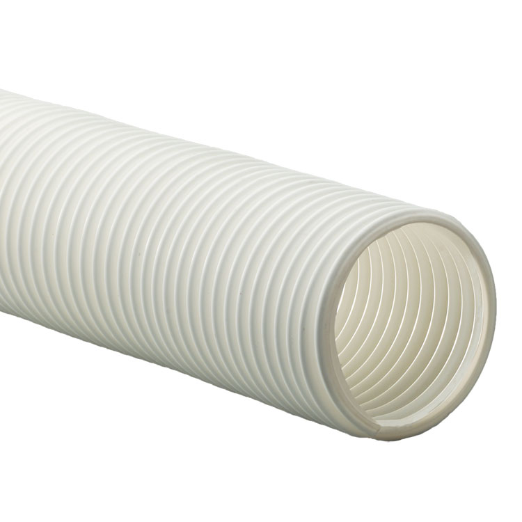 The “Thermoplastic Flex White” is a medium-weight material handling hose that is great for abrasive, dust, and material collection applications. This product is specifically made from FDA acceptable hose material, which makes it suitable for food and drug-related applications. The thermoplastic rubber used in this product provides good chemical and heat resistance, and is also able to withstand higher temperatures than ordinary rubber products. Thermoplastic rubber refers to a class of copolymers that are made from a mixture of plastic and rubber. This combination results in a material that offers good chemical and UV resistance. This thermoplastic hose is also reinforced with a spring steel wire helix for added protection and stability. This resilient quality is important when using the food grade hose in rough and unforgiving environments. The smooth interior of this hose material allows for minimal friction loss and provides efficient airflow.